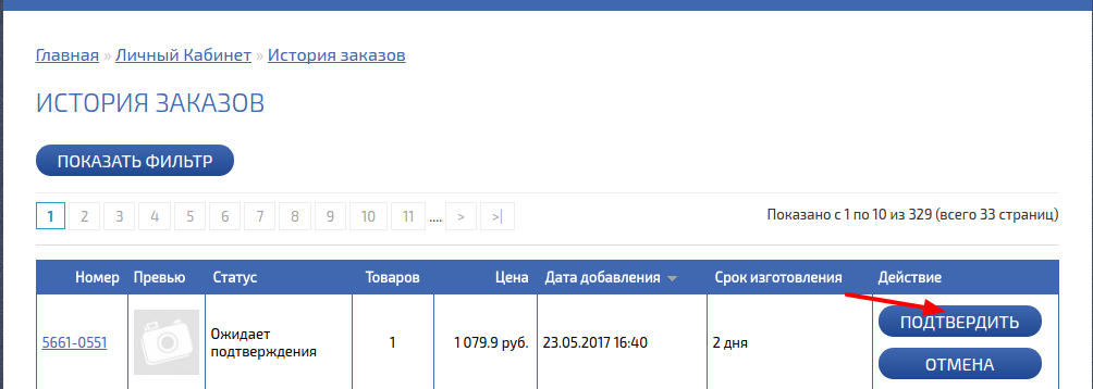 1. На странице Истории Заказов в Личном кабинете нажимаем «Подтвердить» в строке с нужным заказом.