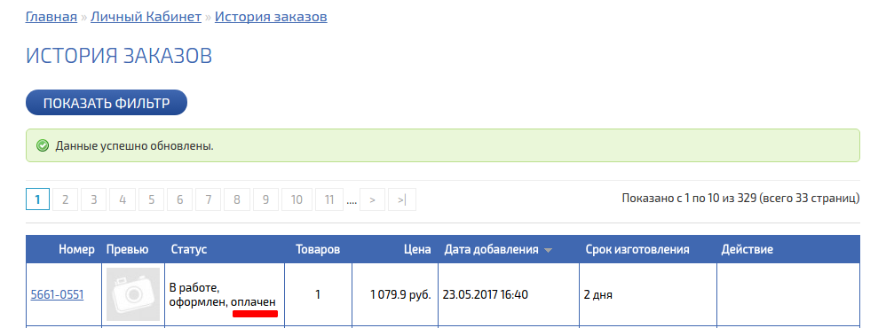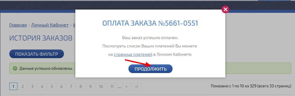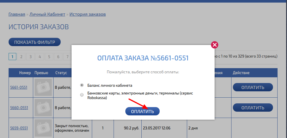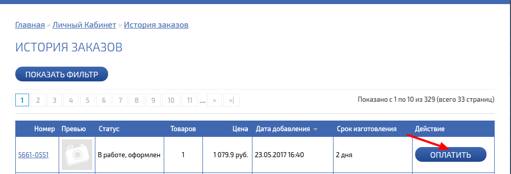 7. На странице Истории Заказов в Личном кабинете нажимаем кнопку «Оплатить» в строке с нужным заказом.