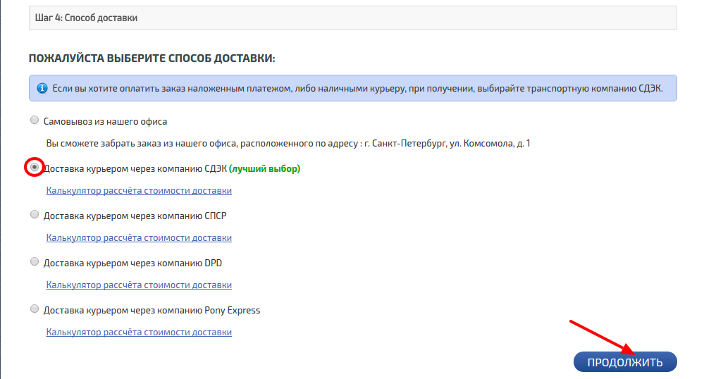 Выбираем способ доставки и нажимаем кнопку «Продолжить».