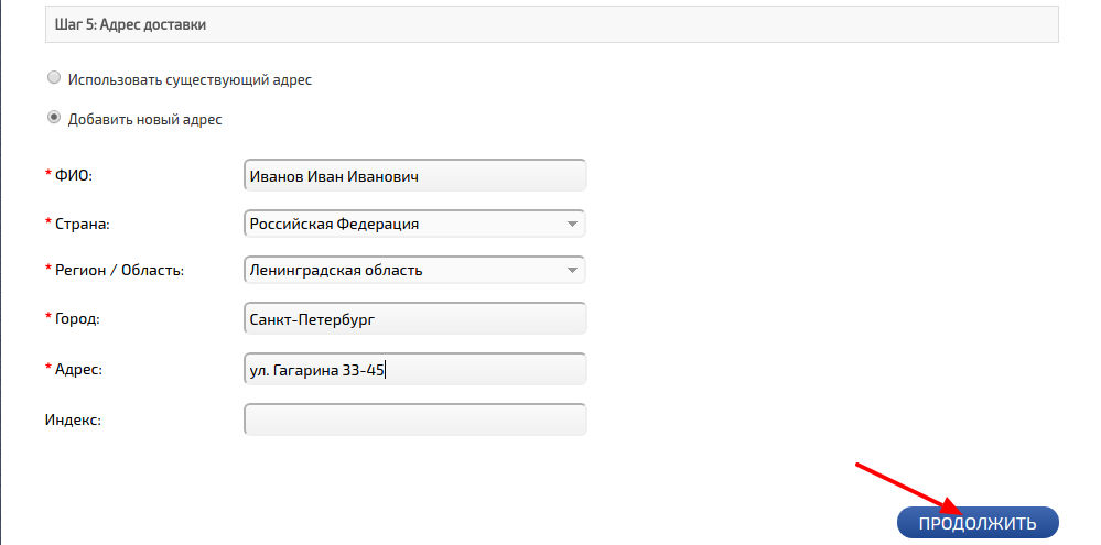 Заполняем необходимые поля адреса доставки и нажимаем кнопку «Продолжить».