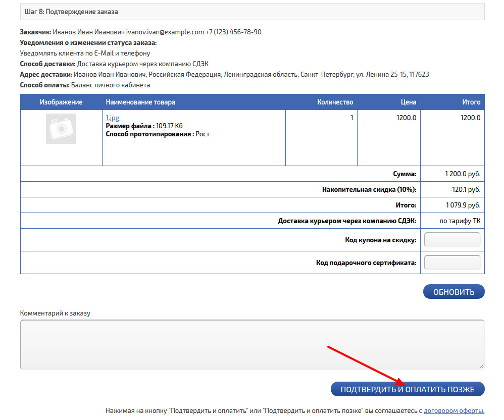 Проверяем заказ, при наличии купона или сертификата применяем их, нажимаем кнопку «Подтвердить и оплатить позже».