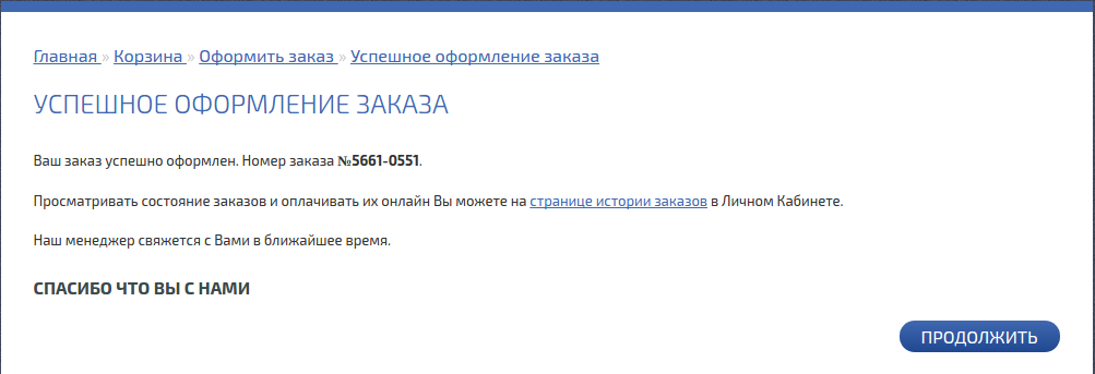 6. Вы попадаете на страницу успешного оформления заказа. Поздравляем! Ваш заказ подтверждён и оформлен! Теперь Вы можете оплатить заказ онлайн.